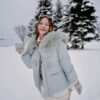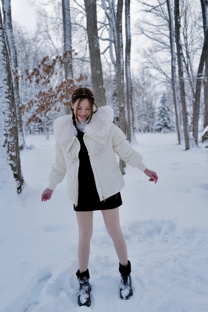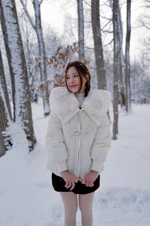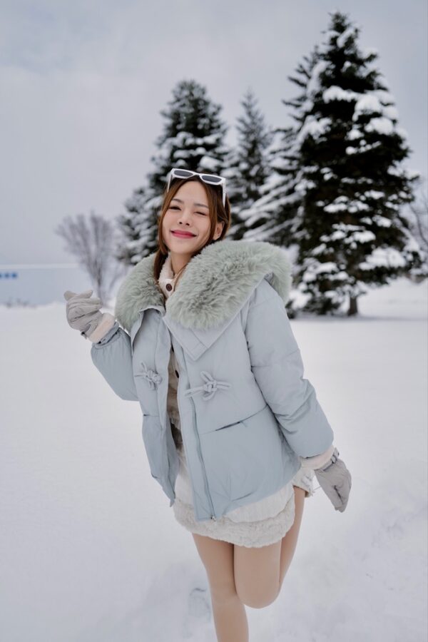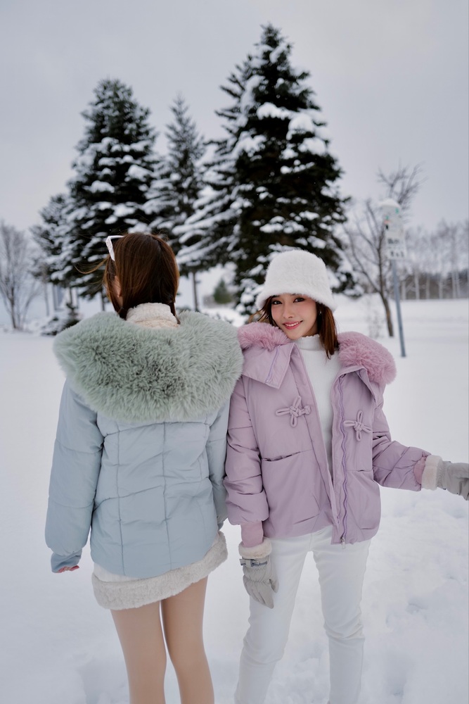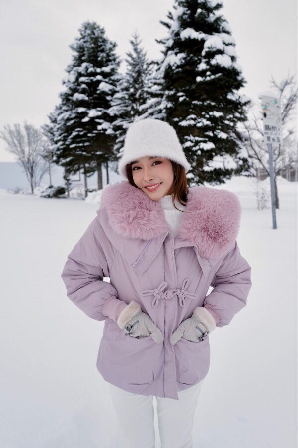 So pretty! Pastel purple, soft fur, perfect fit for my figure. Comfortable to wear, not too big or too small. Taking a photo with white snow is definitely the most beautiful.