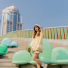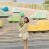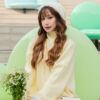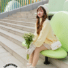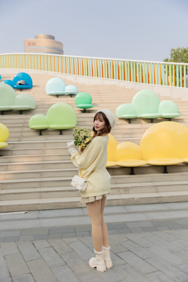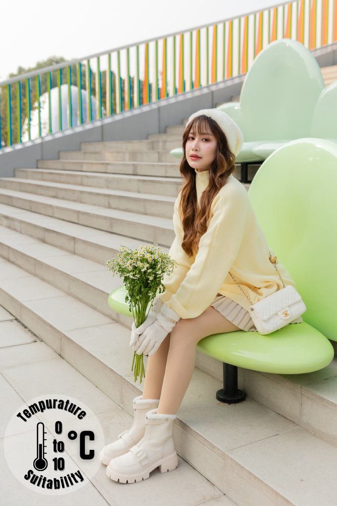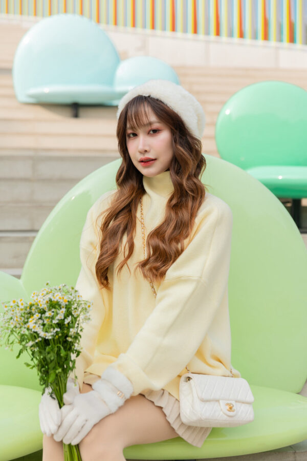 This adorable and chic outfit is perfect for a bright, sunny day out. The core of the look is a cozy yet stylish butter yellow oversized Glow Knit paired with a light-colored Mini Twinkle Skirt. To stay warm and on-trend, she’s wearing nude thermal stockings and a pair of offwhite Snow Belt Boots and Snow Long Boots. Accessories are key to this look’s charm: a white Snowy Beanie, and delicate offwhite Fluffy Gloves to complete the soft, playful aesthetic.