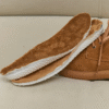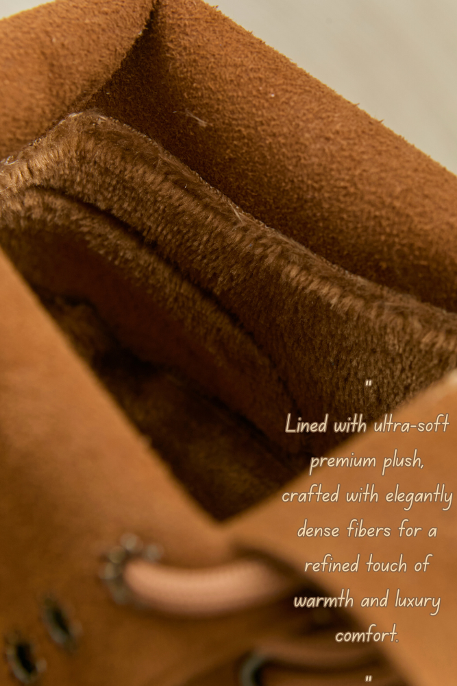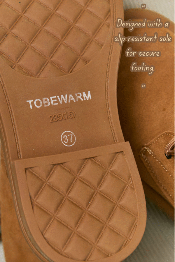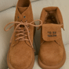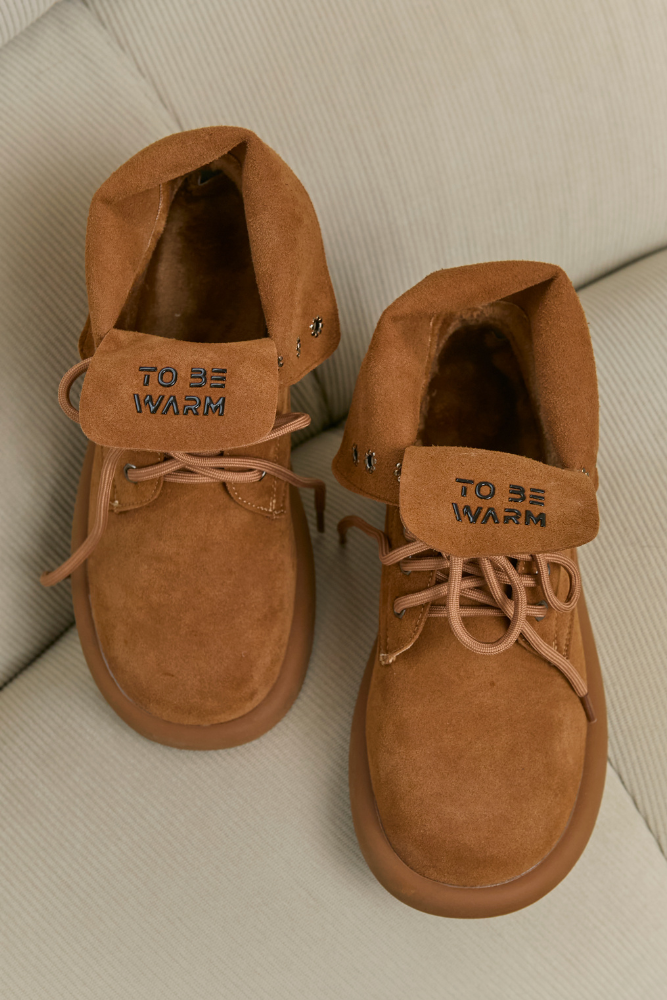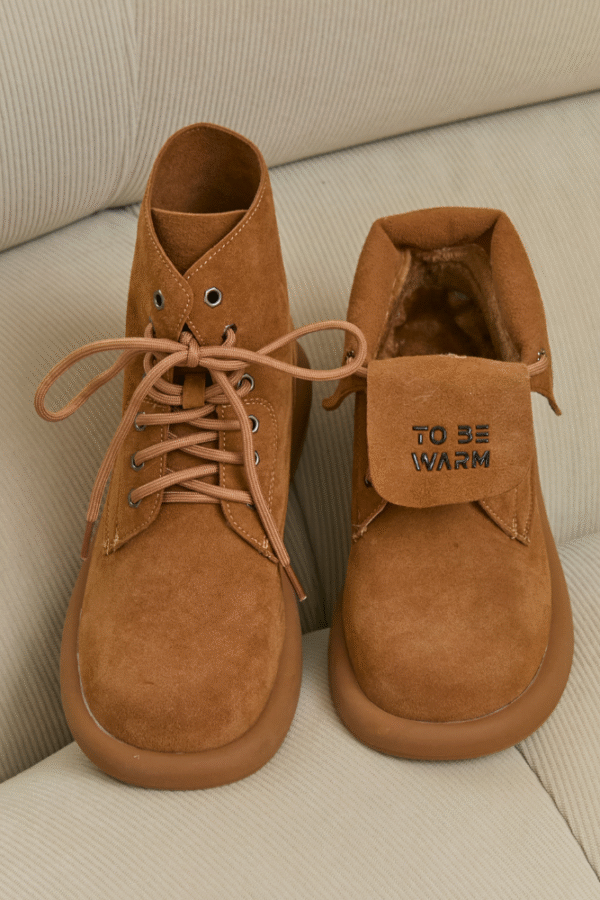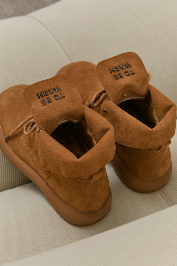 – Fold-Down Collar: Fold the top down to reveal a cozy, fur-lined collar and the subtle “TO BE HAPPY” embroidery, transforming them into a laid-back, mid-height style. This option is ideal for a relaxed vibe, showcasing the plush lining and adding a touch of playful personality.