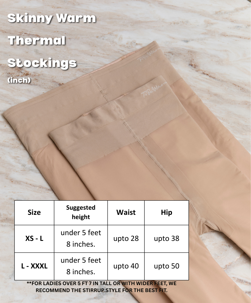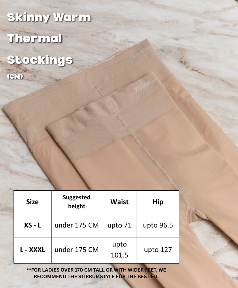 NEW!! Skinny Warm – Sheer thermal stockings with light fleece lining, suitable for 0–15°C.