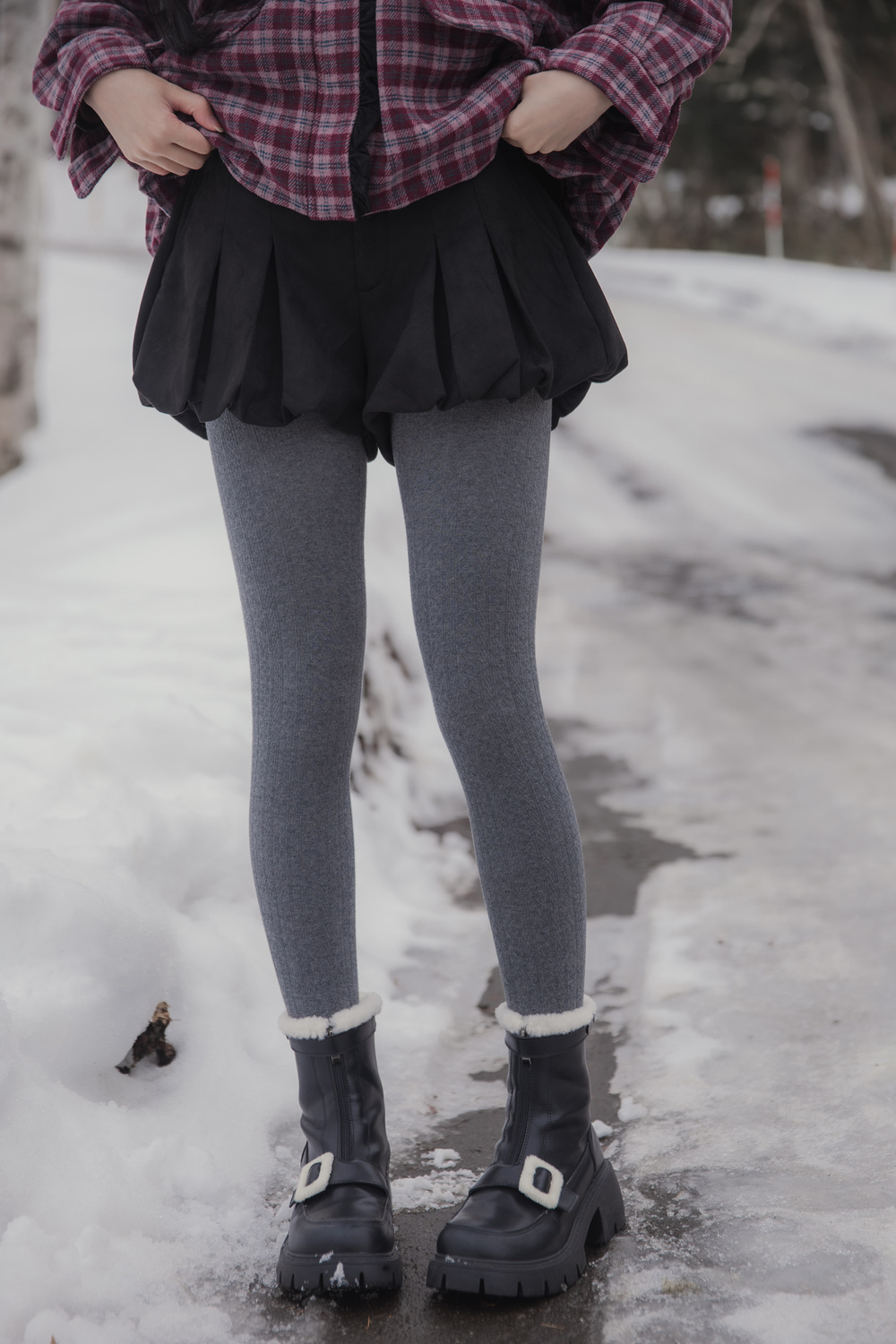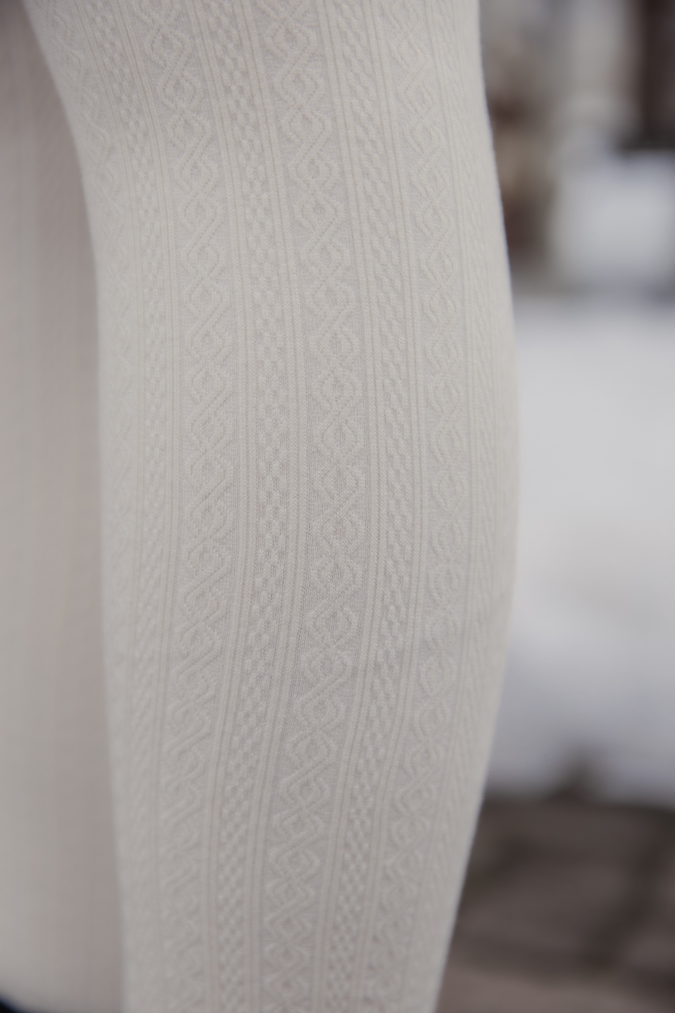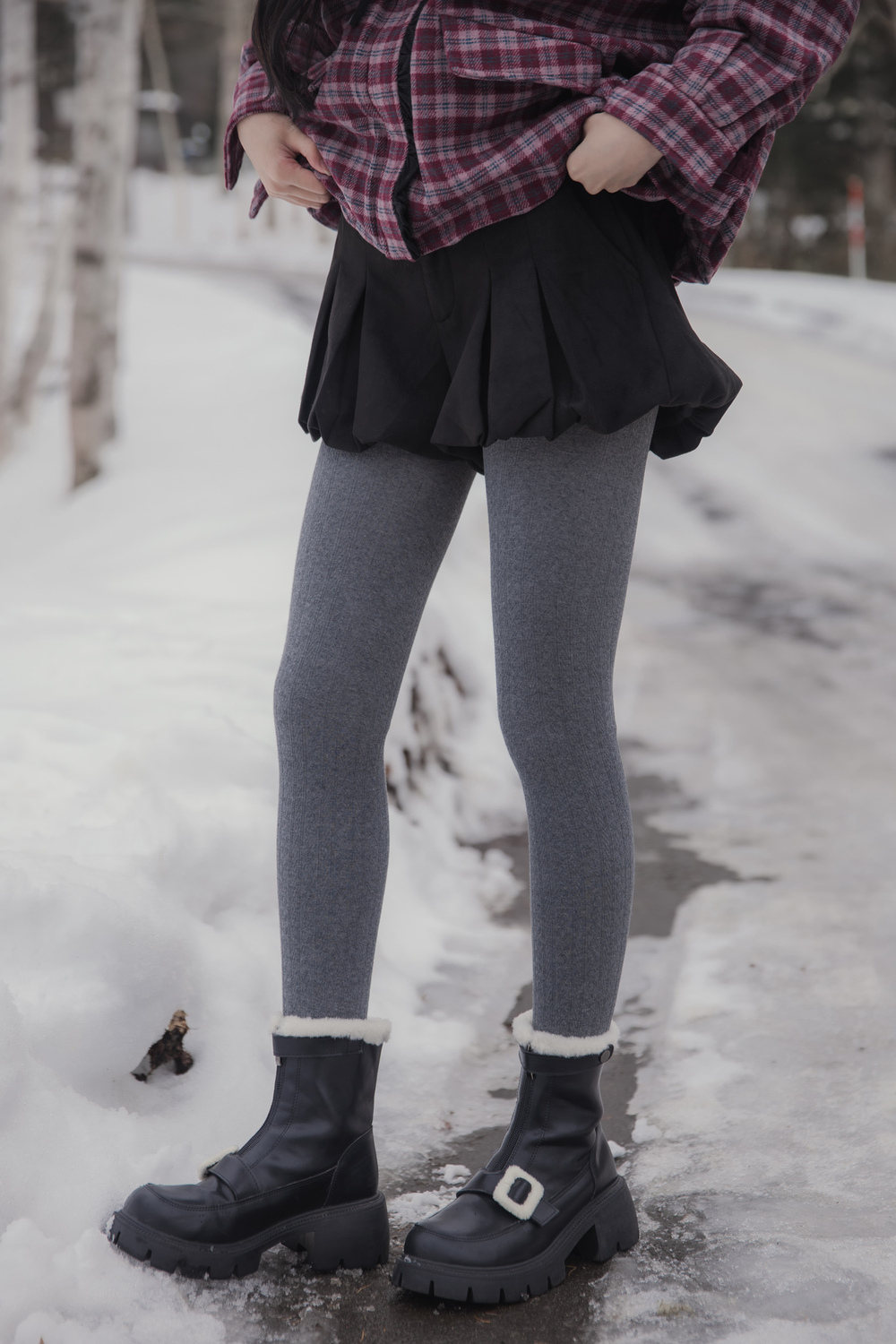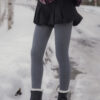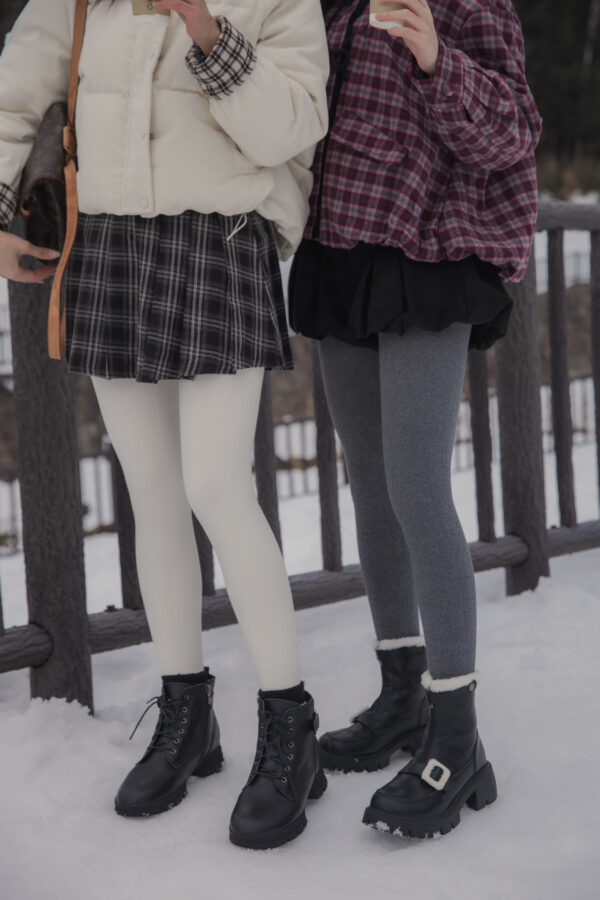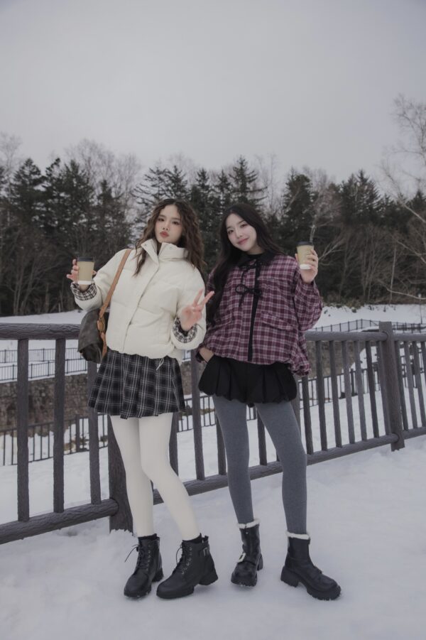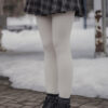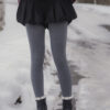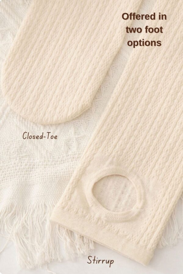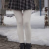 These tights are designed for practical warmth during cold-weather trips. They feature a durable cotton knit exterior with a soft, thin fur lining inside to keep you warm without adding unnecessary bulk to your legs. The vertical cable-knit pattern is functional, helping your legs look leaner and more streamlined in photos.