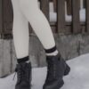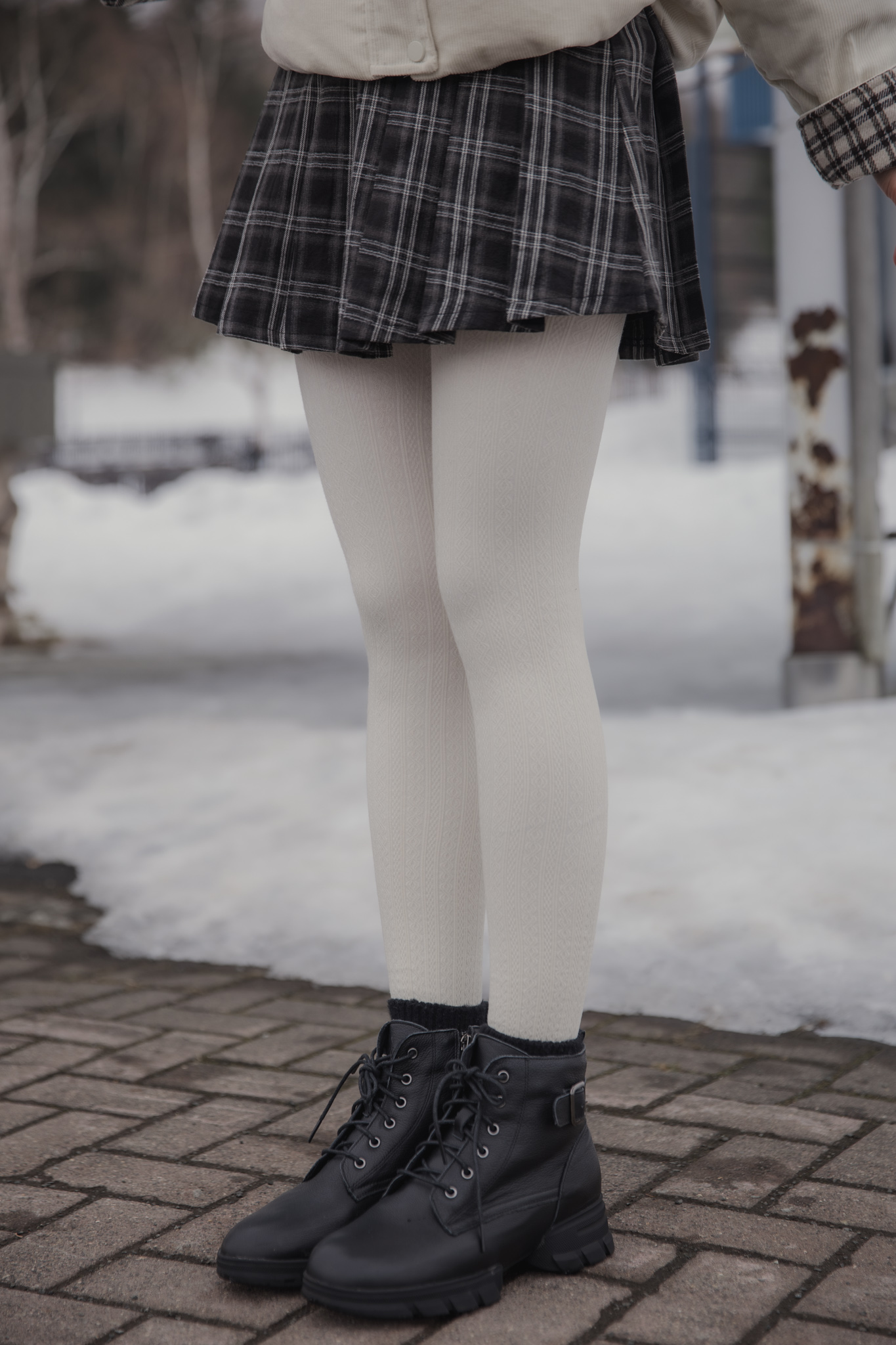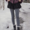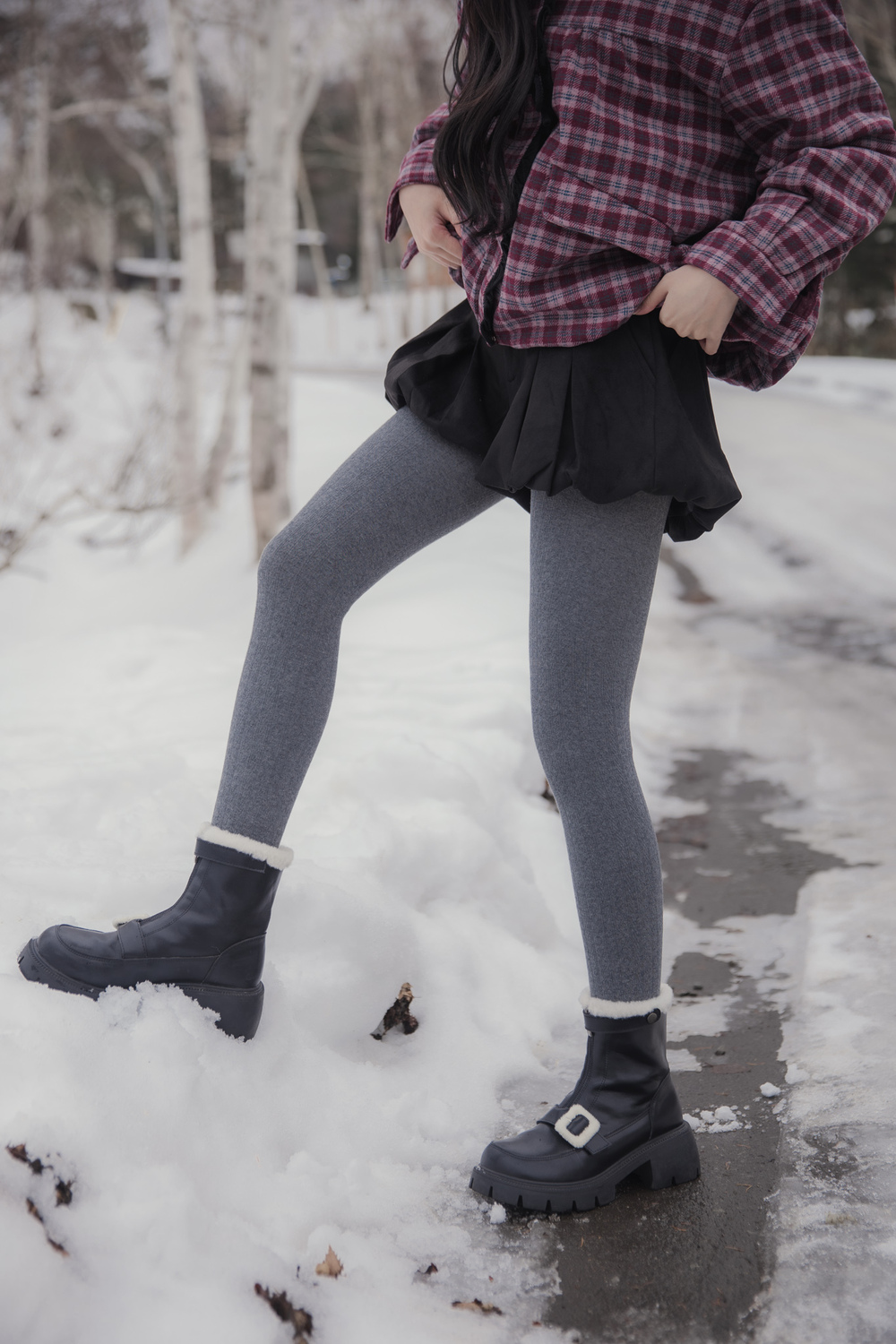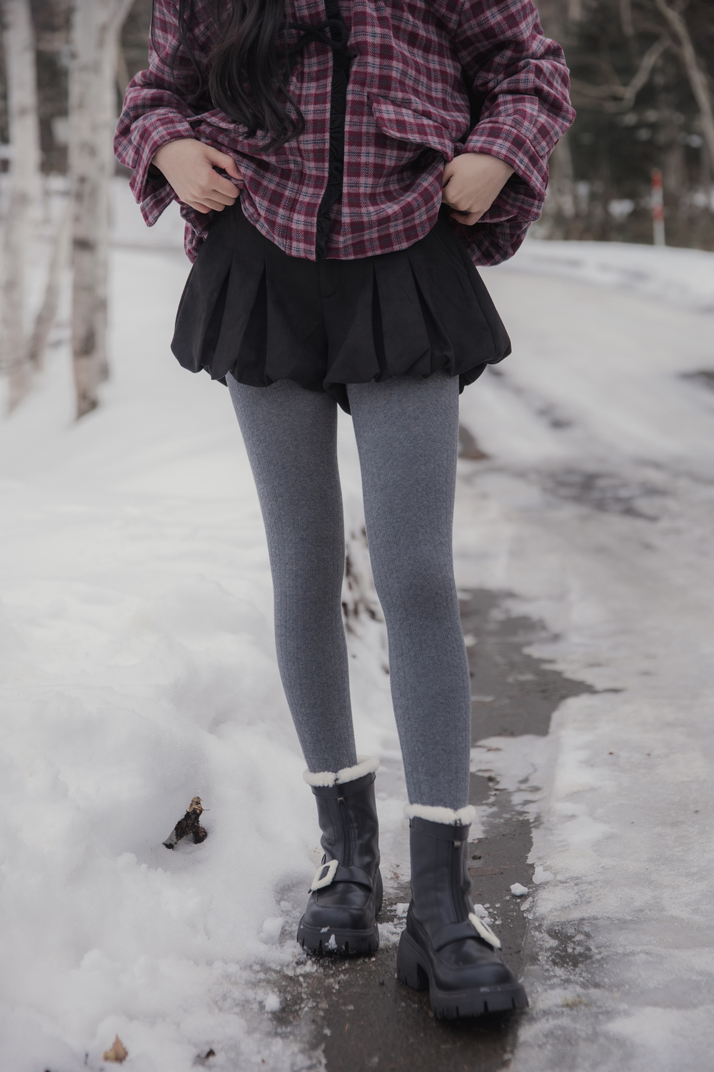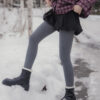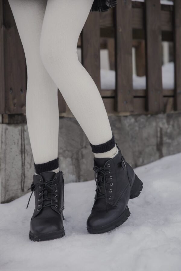 These tights are designed for practical warmth during cold-weather trips. They feature a durable cotton knit exterior with a soft, thin fur lining inside to keep you warm without adding unnecessary bulk to your legs. The vertical cable-knit pattern is functional, helping your legs look leaner and more streamlined in photos.