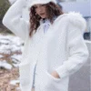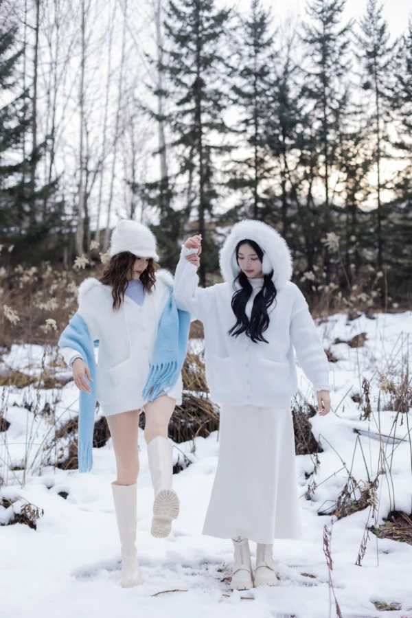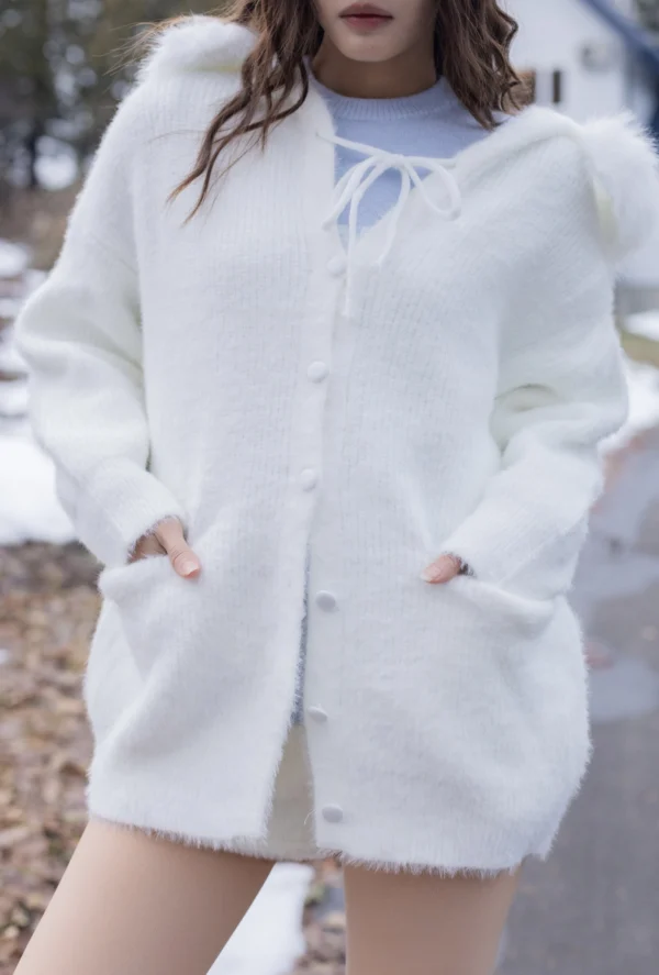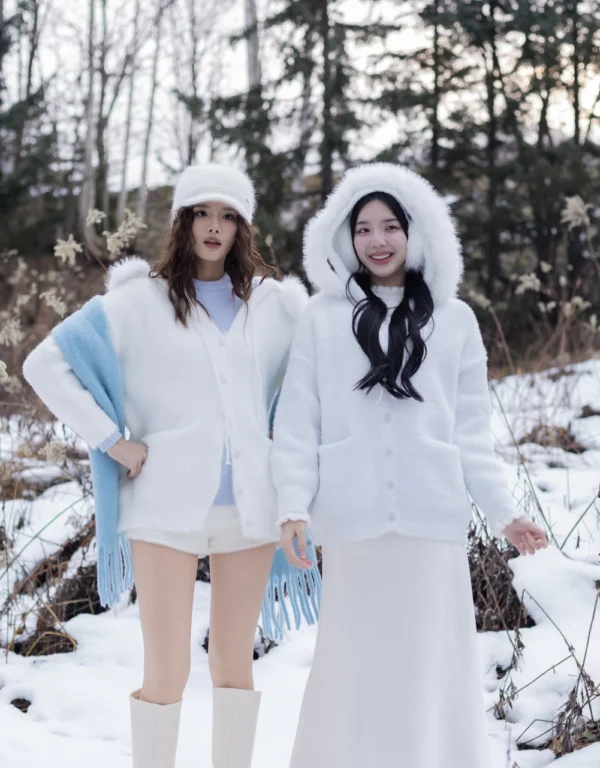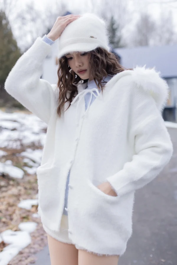 Warm, fuzzy, and incredibly chic, this mink-feel knitted sweater is your ultimate companion for cold-city travels. Features a cozy hood and is beautifully trimmed with detachable faux fur, allowing you to effortlessly switch your look from stylish cardigan to a snug, hooded jacket. This piece is lovely worn solo as a cozy knit top or as a charming outer layer.
