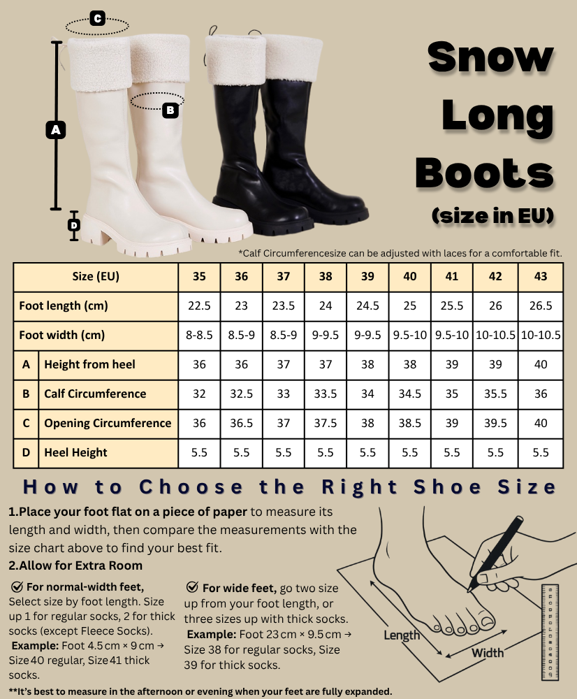 Brave the cold in style with Snow Long Boots, designed for warmth, comfort, and durability in snowy conditions. Featuring a plush fleece lining for extra coziness and a durable PU leather exterior, these boots keep your feet snug and protected. The adjustable lace design ensures a perfect fit, even for those with larger calves, while the anti-slip rubber sole provides excellent traction on icy surfaces. Plus, they’re designed for all-day comfort, making them perfect for long walks in winter weather.