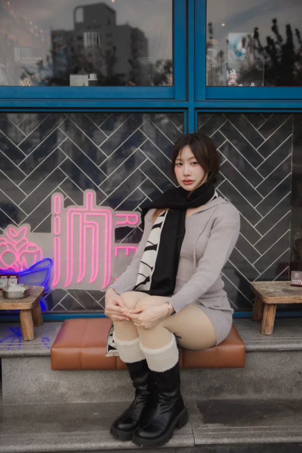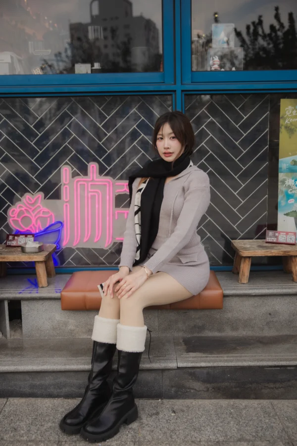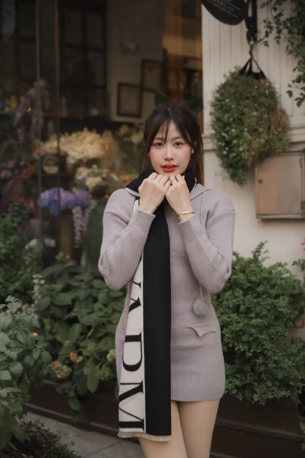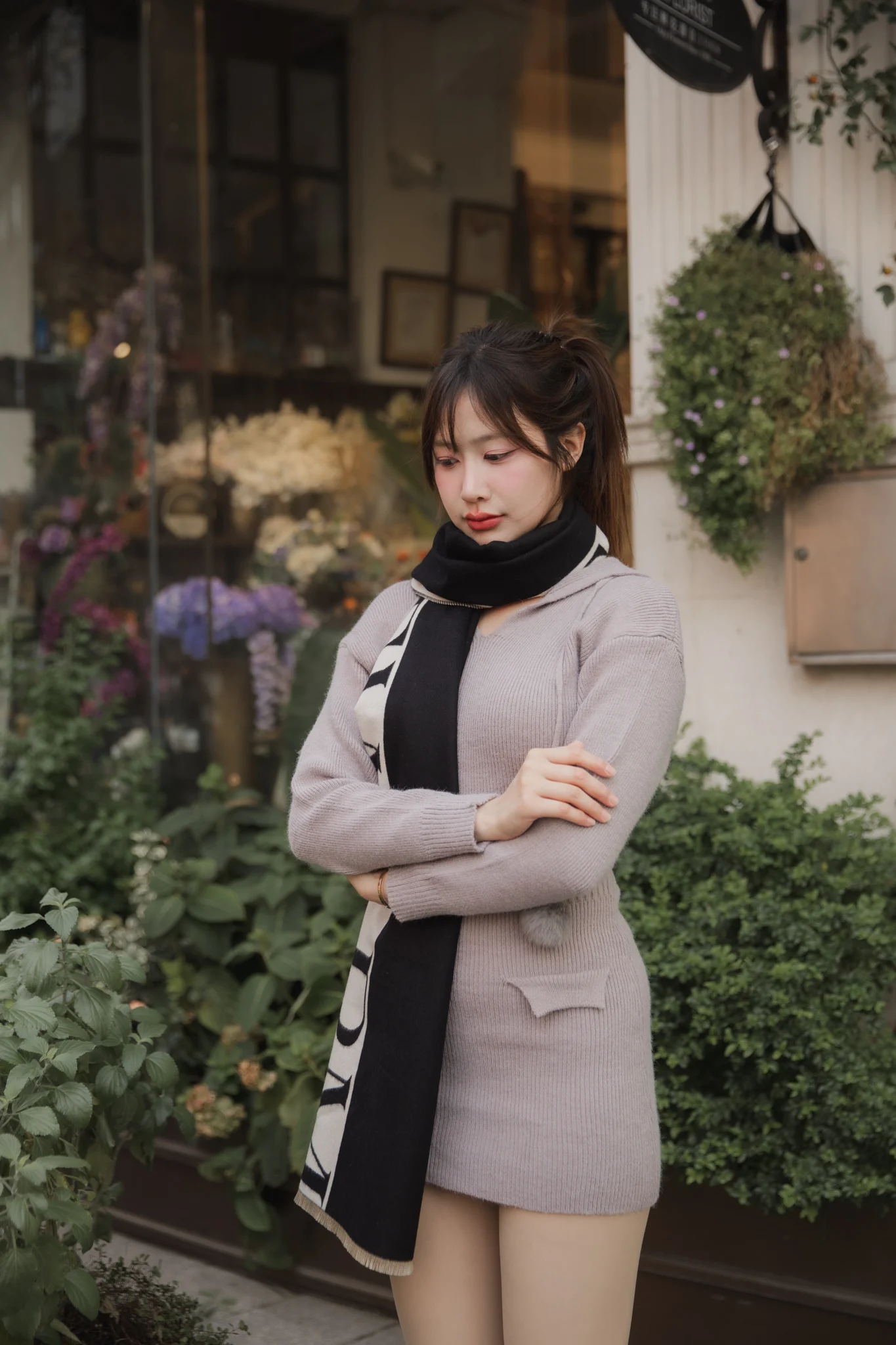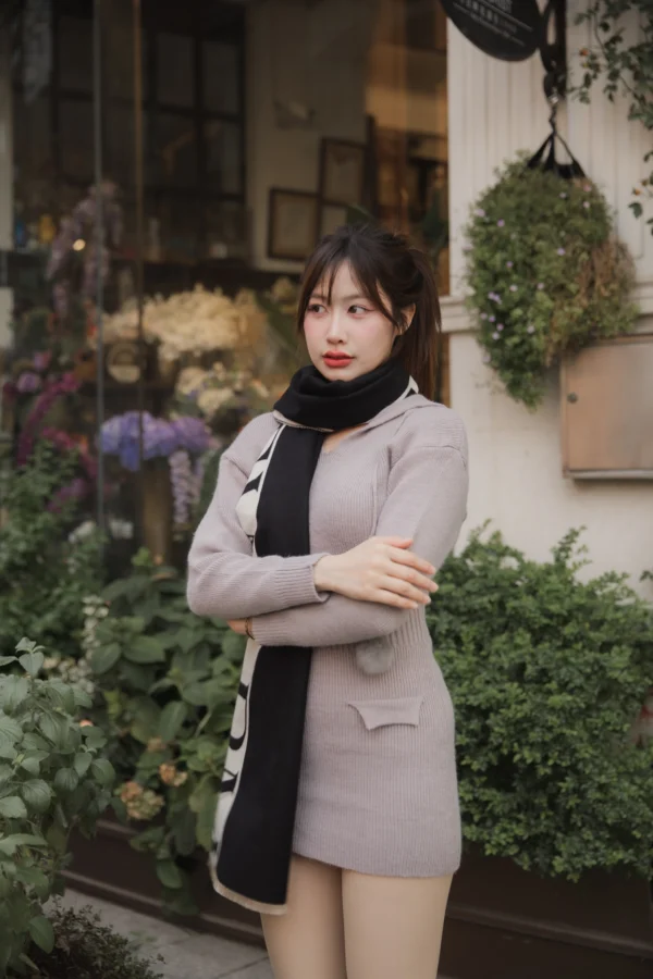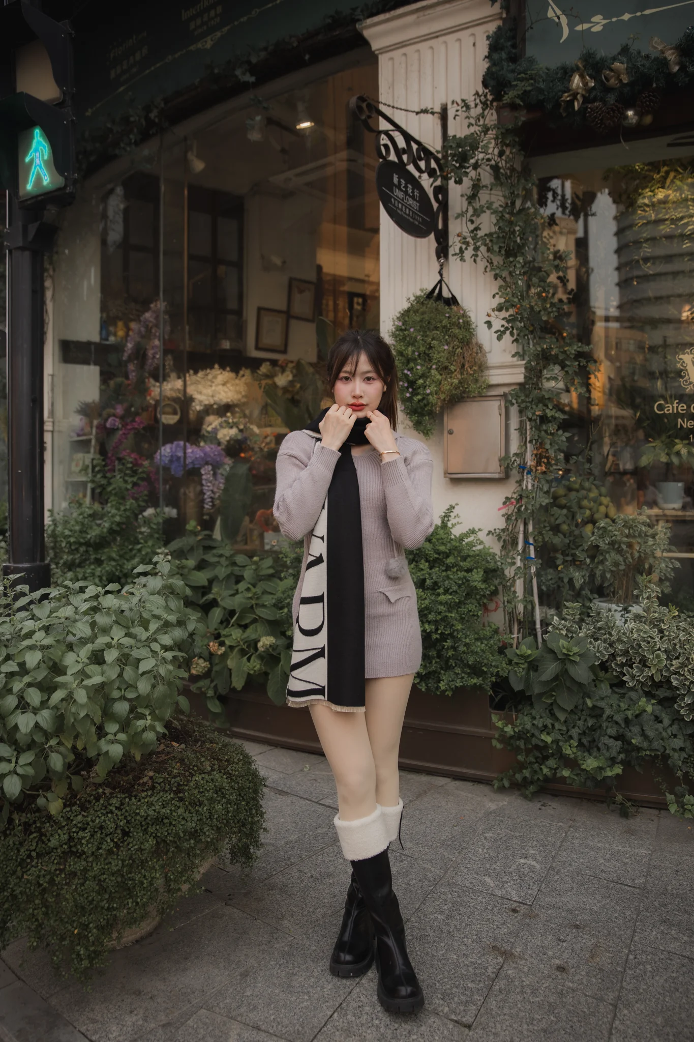 A sweet and feminine winter look featuring a soft mauve knit dress paired with warm nude thermal stockings for a smooth, cozy finish. The bold black-and-cream scarf adds contrast and elegance, while the fluffy-lined black boots provide both warmth and style. Perfect for café dates, strolls through garden-lined streets, or a gentle winter day out where you want comfort wrapped in softness.