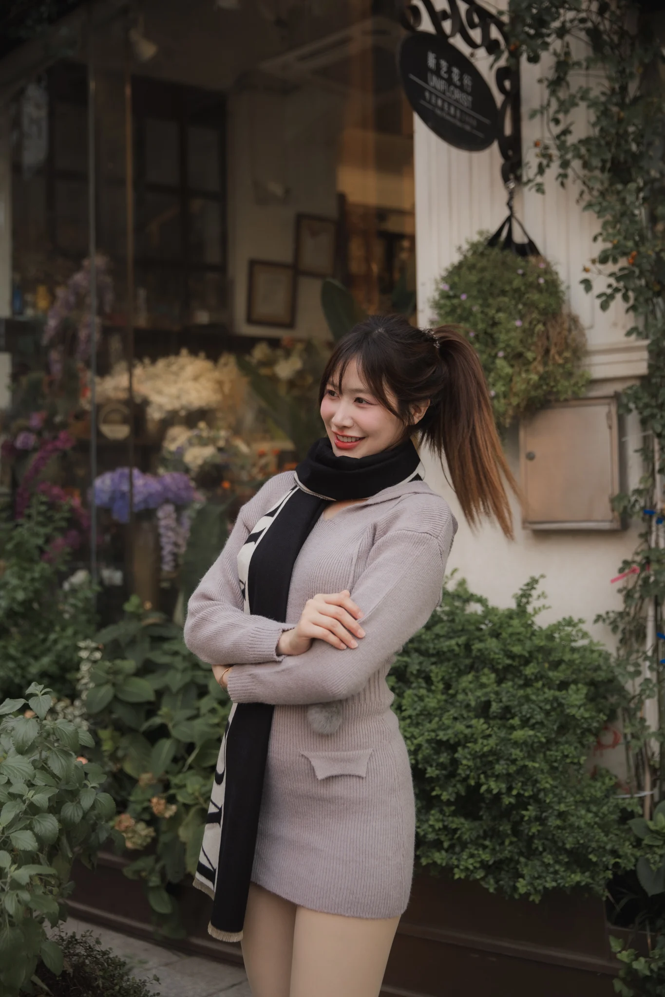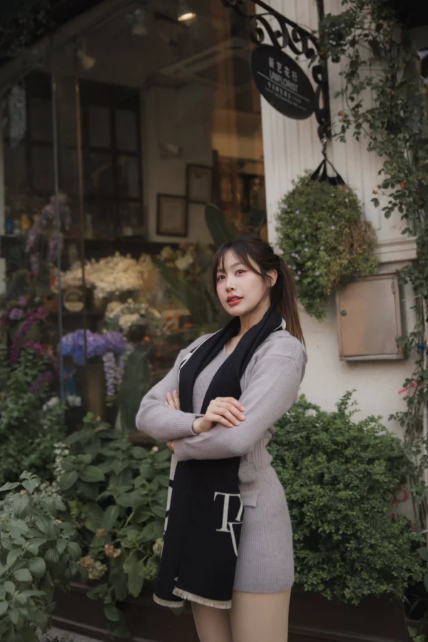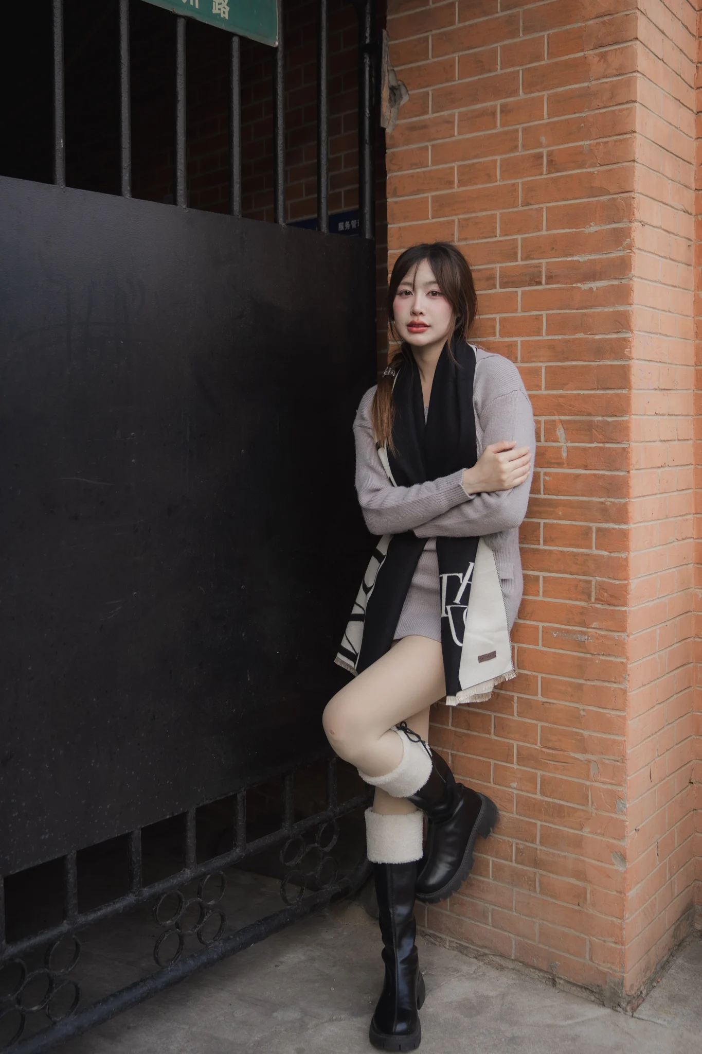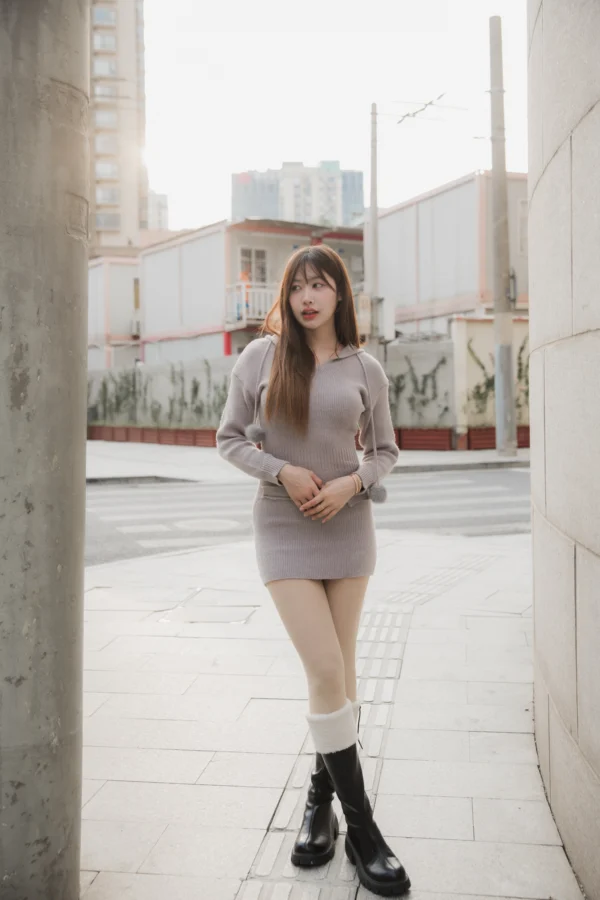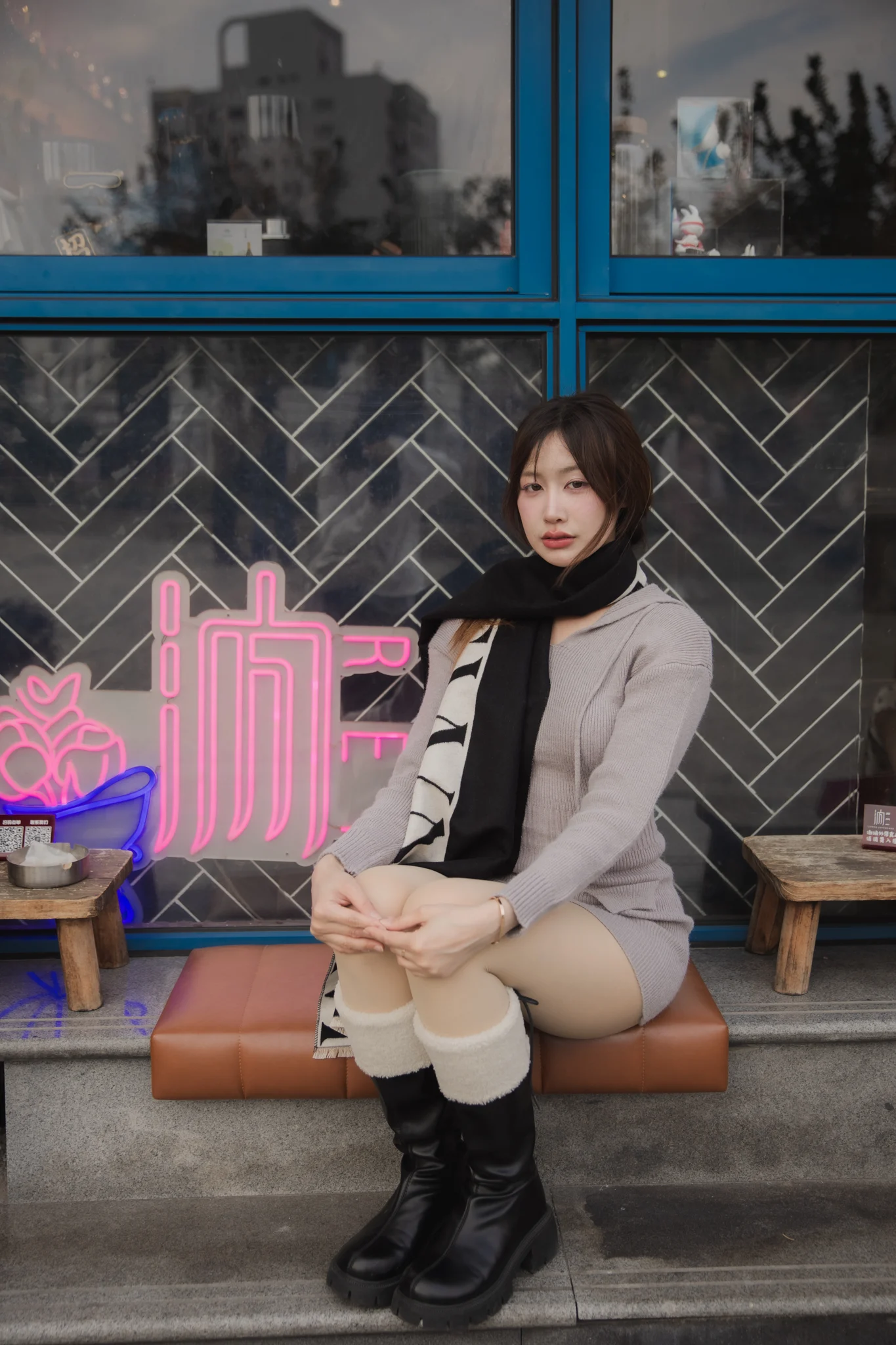 A sweet and feminine winter look featuring a soft mauve knit dress paired with warm nude thermal stockings for a smooth, cozy finish. The bold black-and-cream scarf adds contrast and elegance, while the fluffy-lined black boots provide both warmth and style. Perfect for café dates, strolls through garden-lined streets, or a gentle winter day out where you want comfort wrapped in softness.