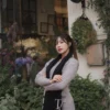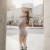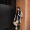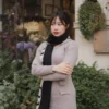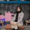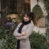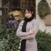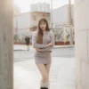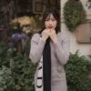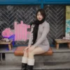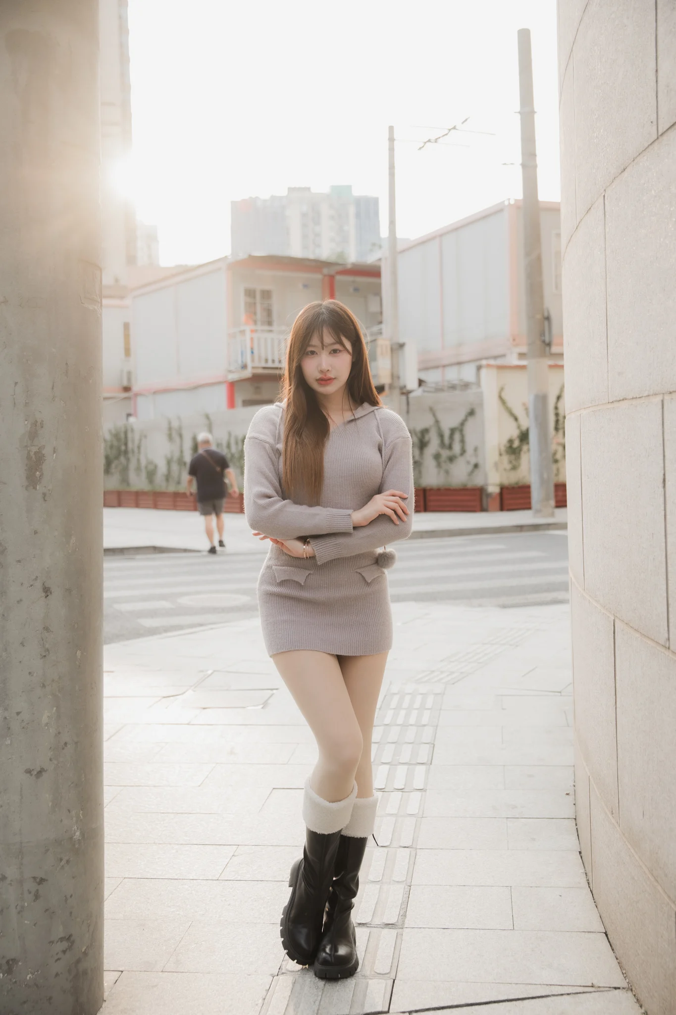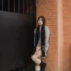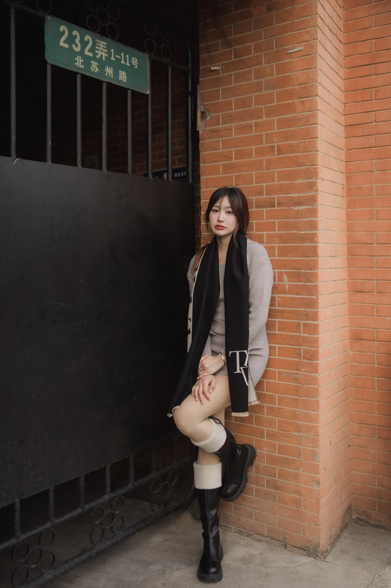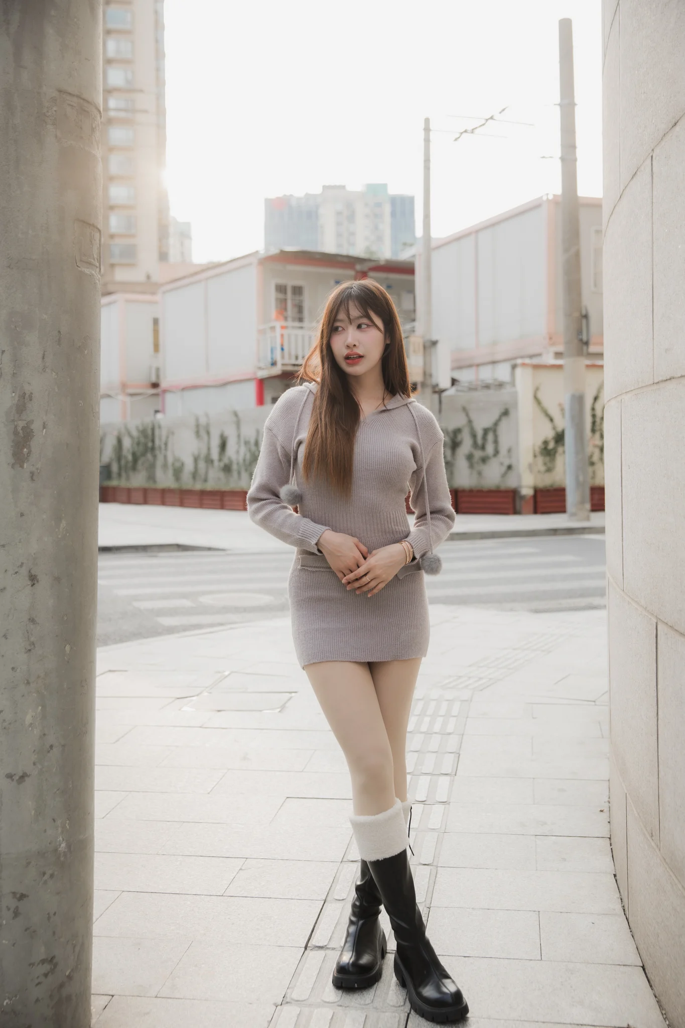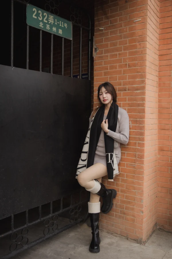 A sweet and feminine winter look featuring a soft mauve knit dress paired with warm nude thermal stockings for a smooth, cozy finish. The bold black-and-cream scarf adds contrast and elegance, while the fluffy-lined black boots provide both warmth and style. Perfect for café dates, strolls through garden-lined streets, or a gentle winter day out where you want comfort wrapped in softness.