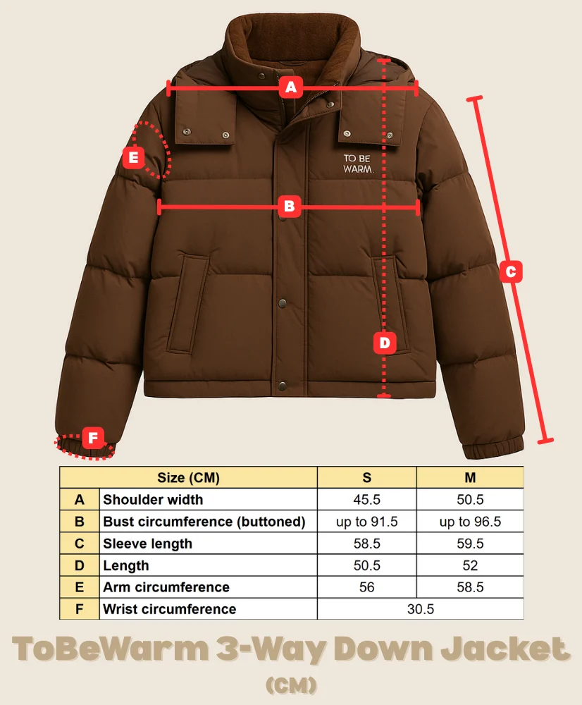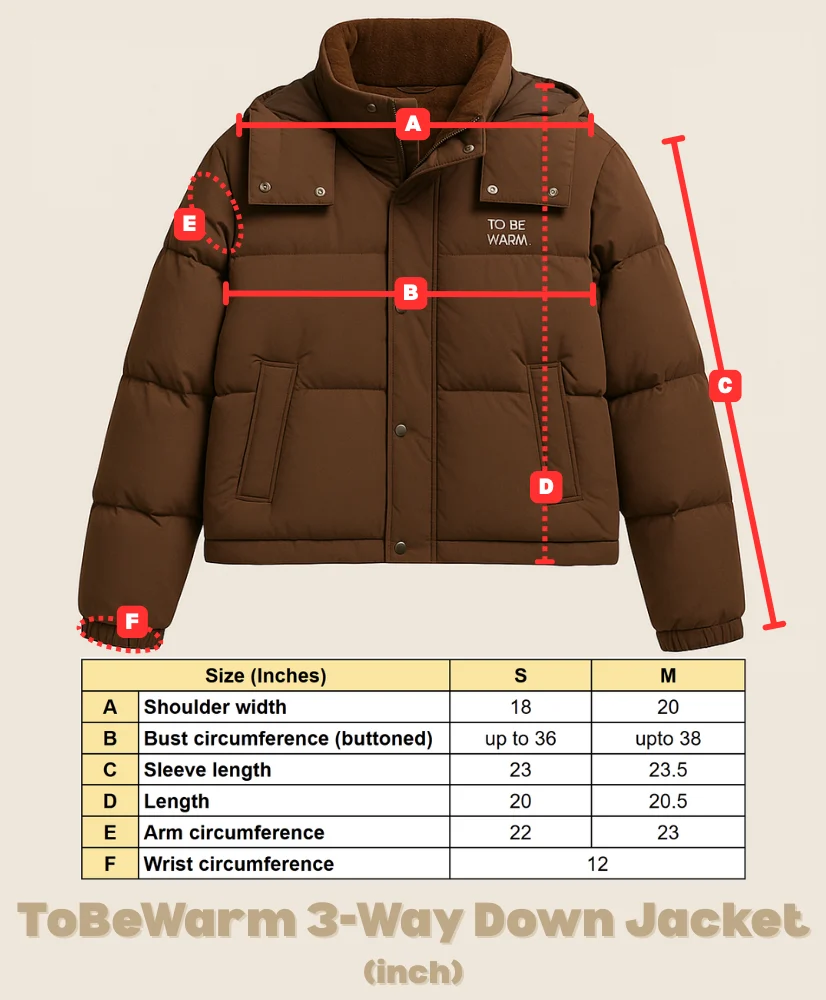 ToBeWarm 3-Way Down Jacket – Wearable from 20°C to -20°C, featuring removable sleeves and hood.